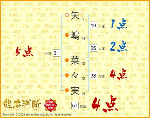 矢(5画)嶋(14画) 菜(12画)々(12画)実(14画)