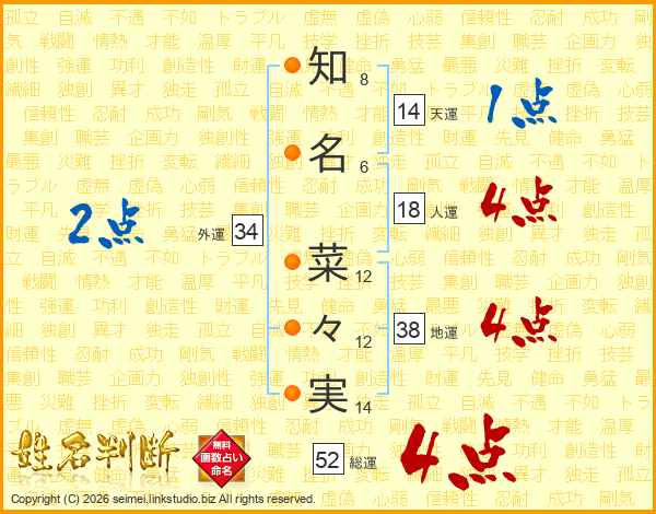 知(8画)名(6画) 菜(12画)々(12画)実(14画)