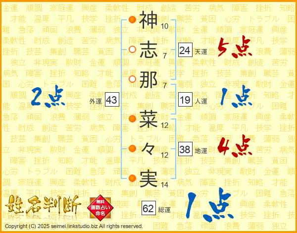 神(10画)志(7画)那(7画) 菜(12画)々(12画)実(14画)