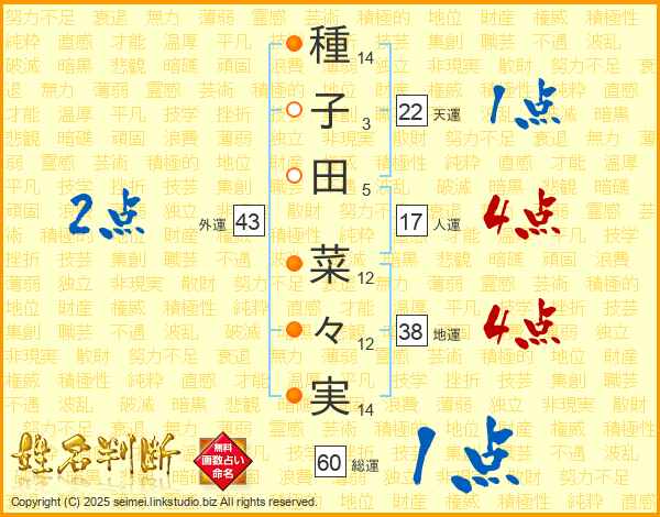 種(14画)子(3画)田(5画)  菜(12画)々(12画)実(14画)