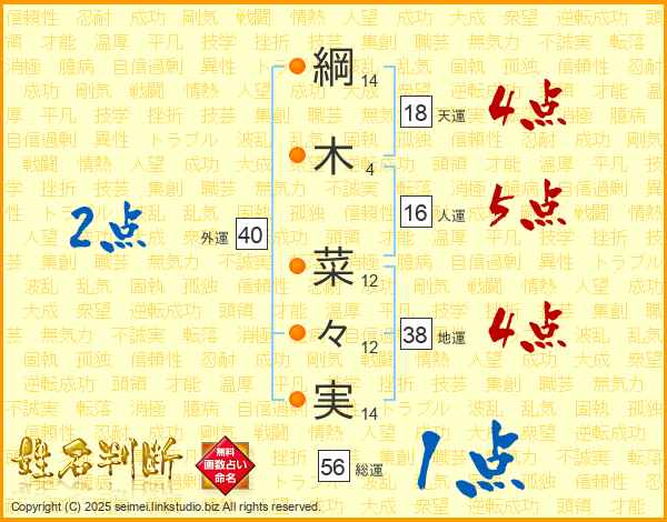 綱(14画)木(4画) 菜(12画)々(12画)実(14画)