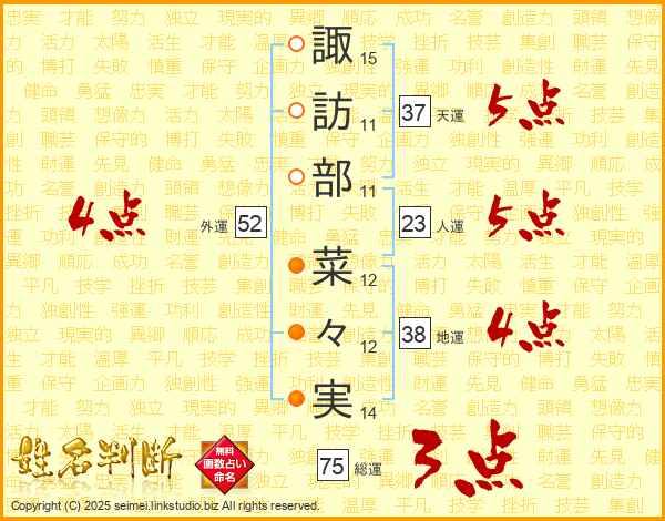 諏(15画)訪(11画)部(11画) 菜(12画)々(12画)実(14画)