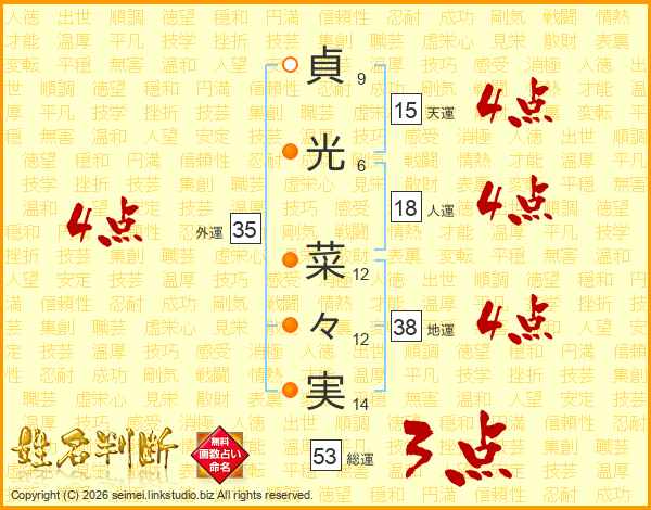 貞(9画)光(6画) 菜(12画)々(12画)実(14画)