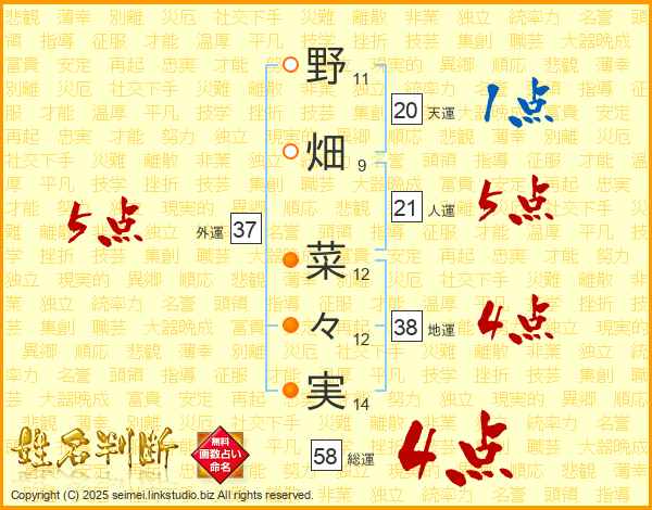 野(11画)畑(9画) 菜(12画)々(12画)実(14画)