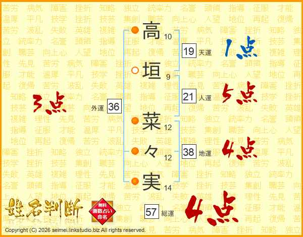 高(10画)垣(9画) 菜(12画)々(12画)実(14画)