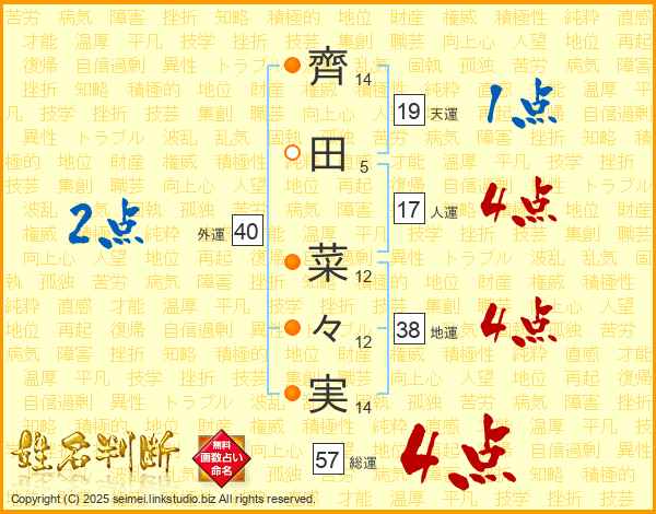 齊(14画)田(5画) 菜(12画)々(12画)実(14画)