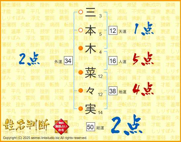 三(3画)本(5画)木(4画)  菜(12画)々(12画)実(14画)