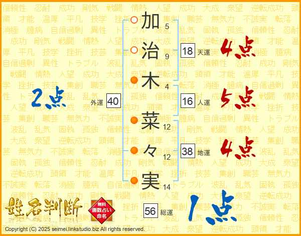 加(5画)治(9画)木(4画) 菜(12画)々(12画)実(14画)