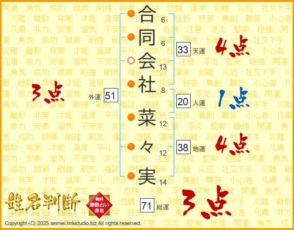 合(6画)同(6画)会(13画)社(8画) 菜(12画)々(12画)実(14画)