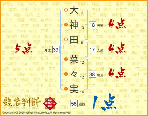 大(3画)神(10画)田(5画) 菜(12画)々(12画)実(14画)