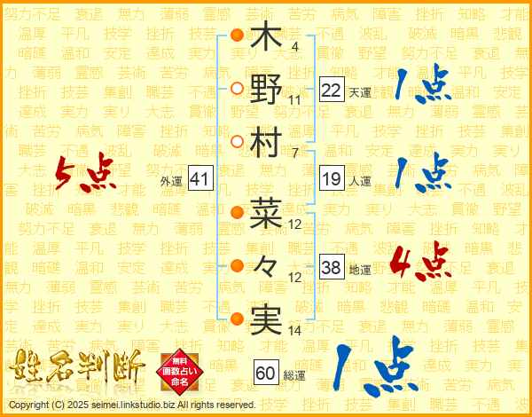 木(4画)野(11画)村(7画) 菜(12画)々(12画)実(14画)