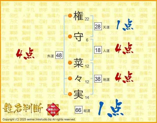 権(22画)守(6画) 菜(12画)々(12画)実(14画)