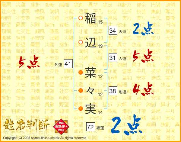 稲(15画)辺(19画) 菜(12画)々(12画)実(14画)