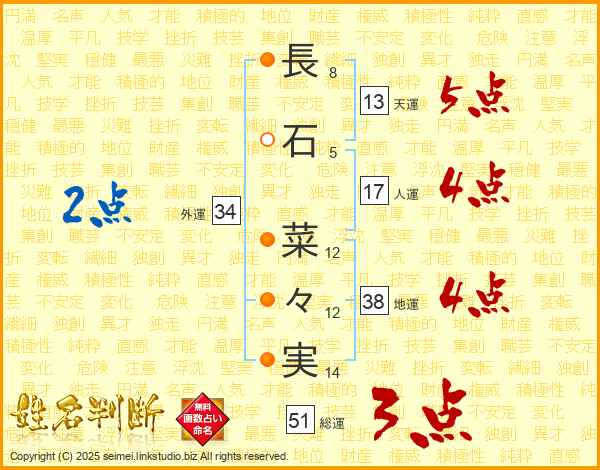 長(8画)石(5画) 菜(12画)々(12画)実(14画)