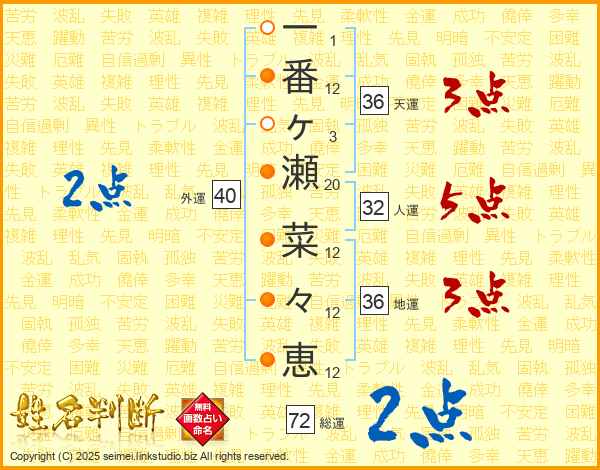 一番ヶ瀬菜々恵さんの総運は72画の2点!