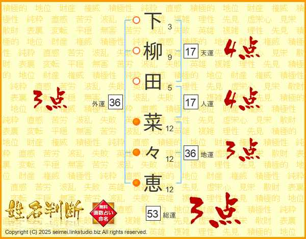 下柳田菜々恵さんの総運は53画の3点!
