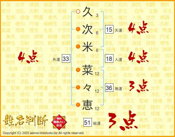 久(3画)次(6画)米(6画) 菜(12画)々(12画)恵(12画)