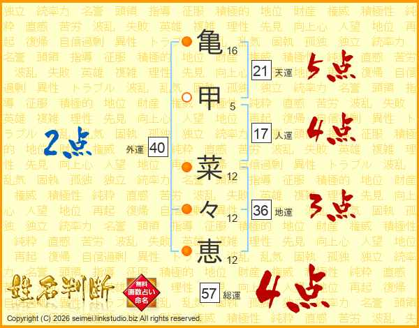 亀(16画)甲(5画) 菜(12画)々(12画)恵(12画)