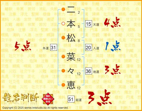 二(2画)本(5画)松(8画) 菜(12画)々(12画)恵(12画)