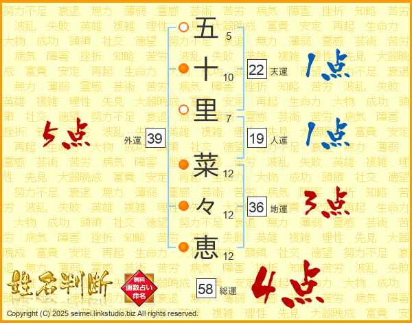 五(5画)十(10画)里(7画) 菜(12画)々(12画)恵(12画)