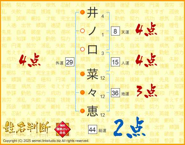 井(4画)ノ(1画)口(3画) 菜(12画)々(12画)恵(12画)