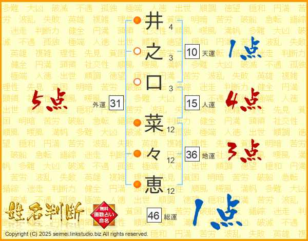 井(4画)之(3画)口(3画) 菜(12画)々(12画)恵(12画)