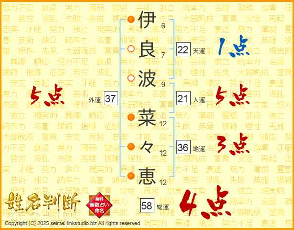 伊(6画)良(7画)波(9画) 菜(12画)々(12画)恵(12画)