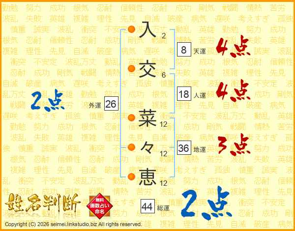 入(2画)交(6画) 菜(12画)々(12画)恵(12画)