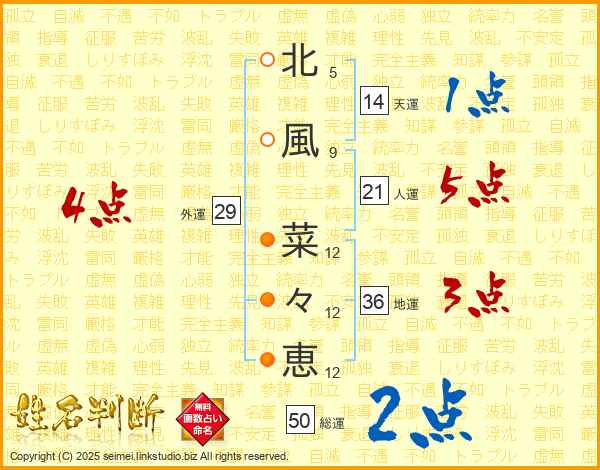 北(5画)風(9画) 菜(12画)々(12画)恵(12画)