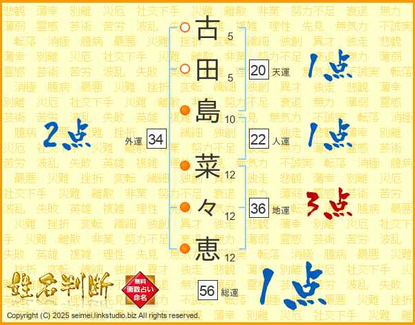 古(5画)田(5画)島(10画) 菜(12画)々(12画)恵(12画)