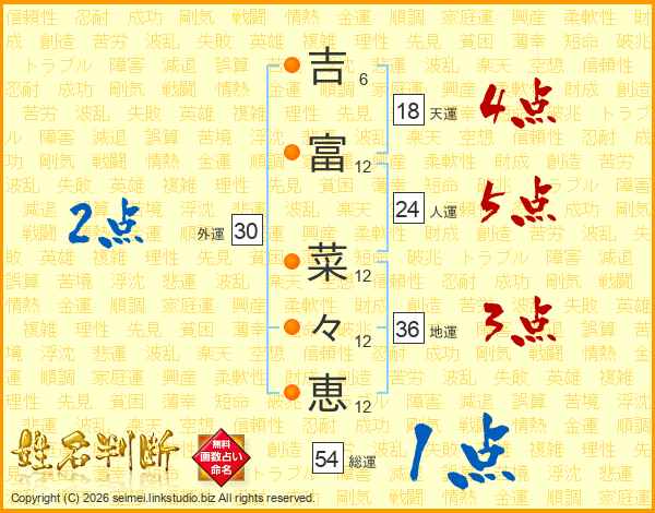 吉(6画)富(12画) 菜(12画)々(12画)恵(12画)