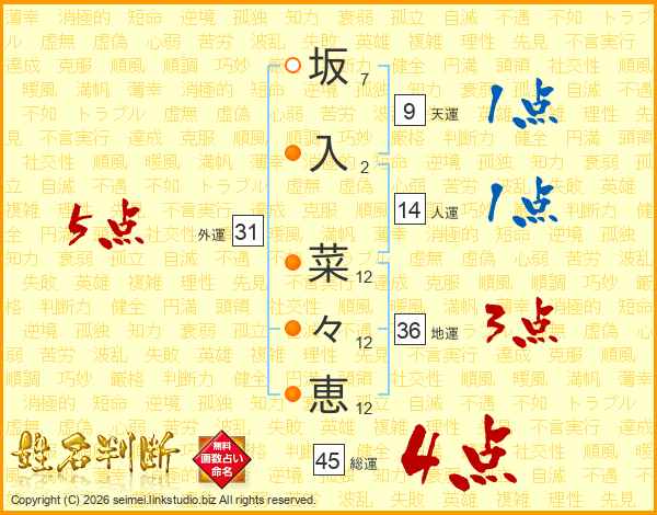 坂(7画)入(2画) 菜(12画)々(12画)恵(12画)