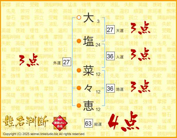 大(3画)塩(24画) 菜(12画)々(12画)恵(12画)