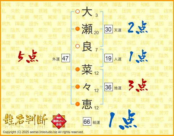 大(3画)瀬(20画)良(7画) 菜(12画)々(12画)恵(12画)
