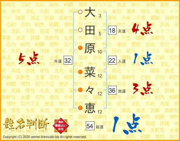 大(3画)田(5画)原(10画) 菜(12画)々(12画)恵(12画)