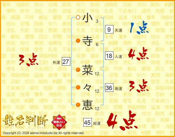小(3画)寺(6画)  菜(12画)々(12画)恵(12画)
