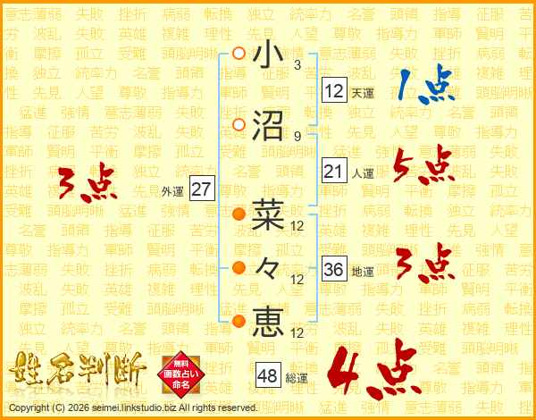 小(3画)沼(9画) 菜(12画)々(12画)恵(12画)