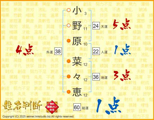小(3画)野(11画)原(10画) 菜(12画)々(12画)恵(12画)