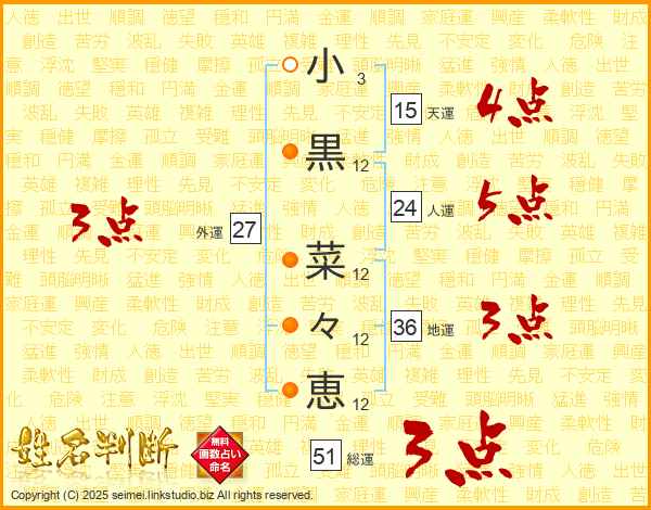小(3画)黒(12画) 菜(12画)々(12画)恵(12画)