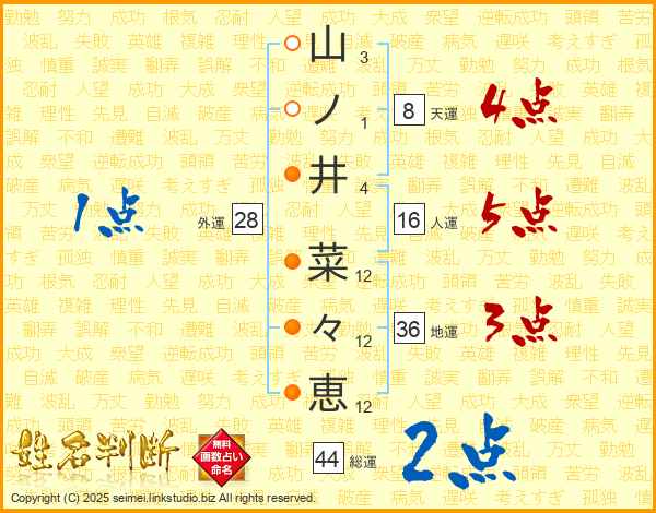 山(3画)ノ(1画)井(4画) 菜(12画)々(12画)恵(12画)