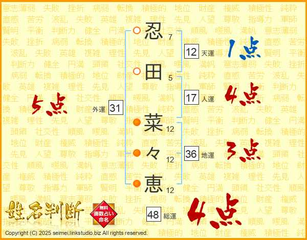 忍(7画)田(5画) 菜(12画)々(12画)恵(12画)