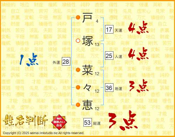 戸(4画)塚(13画) 菜(12画)々(12画)恵(12画)