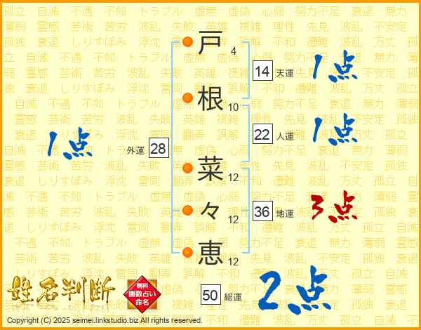 戸(4画)根(10画) 菜(12画)々(12画)恵(12画)