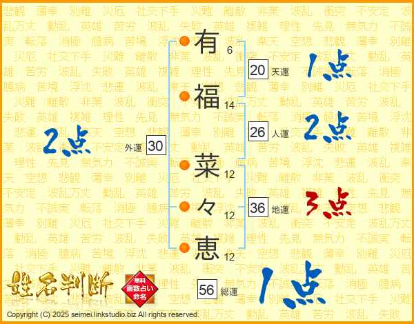 有(6画)福(14画) 菜(12画)々(12画)恵(12画)