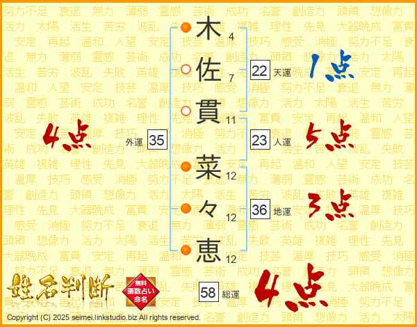 木(4画)佐(7画)貫(11画) 菜(12画)々(12画)恵(12画)