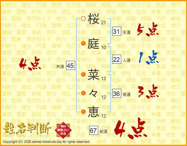 桜(21画)庭(10画) 菜(12画)々(12画)恵(12画)