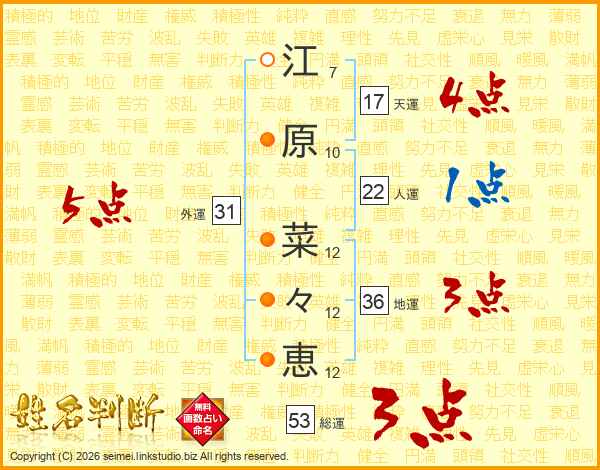 江(7画)原(10画) 菜(12画)々(12画)恵(12画)