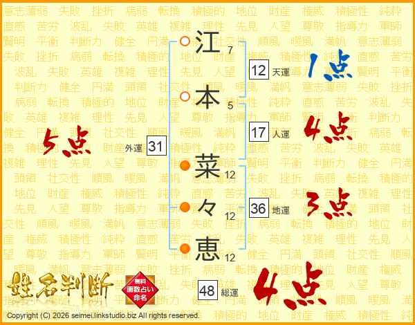 江(7画)本(5画) 菜(12画)々(12画)恵(12画)