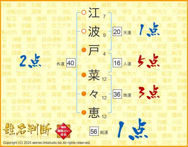 江(7画)波(9画)戸(4画) 菜(12画)々(12画)恵(12画)