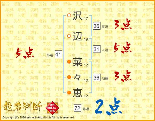 沢辺菜々恵さんの総運は72画の2点!